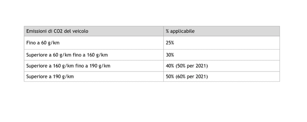 - per i contratti stipulati dall’1.7.2020 la percentuale applicabile all’importo corrispondente alla percorrenza convenzionale di 15.000 km risulta variabile in relazione alla classe di inquinamento del veicolo (di nuova immatricolazione) come di seguito specificato: